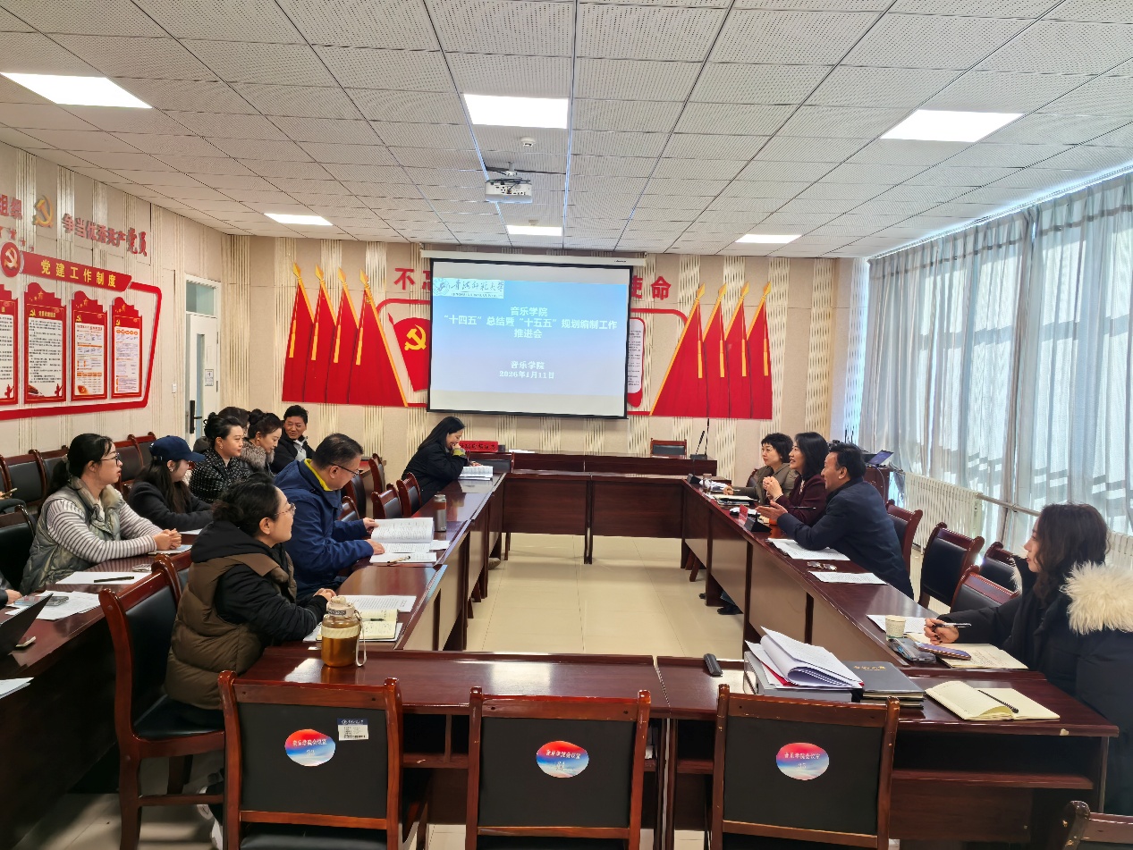为系统总结“十四五”发展成效,科学谋划未来五年发展蓝图,2026年1月11日上午,音乐学院在三楼会议室召开“十四五”总结暨“十五五”规划编制工作推进会。校党委副书记、常务副校长胡亚玲莅临指导,学院领导班子成员、各教研室主任及教师代表参会,会议由学院党委书记主持。
